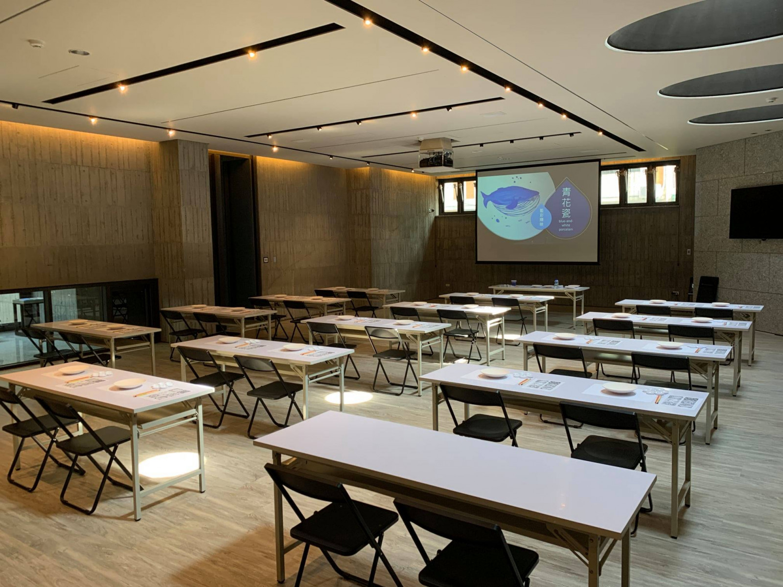 在輕婉柔和的音樂牽引下,每一位參加者跟隨理和同仁的帶領步入講堂,敞開的天井在午後的席間映入一道道暖黃的光影,彷彿沐浴在涼秋裡溫煦的日照之中,每個人都坐定了各自屬意的位置,看著桌上早先預備好的青料與繪製用具,腦中似乎也開始能勾勒出即將綻開的朵朵青花與各種想像。